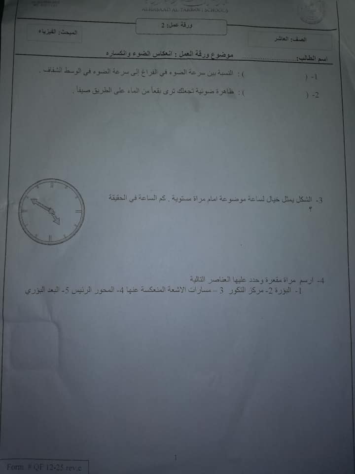 ورقة عمل انعكاس الضوء وانكساره لمادة الفيزياء للصف العاشر الفصل الأول منتديات صقر الجنوب