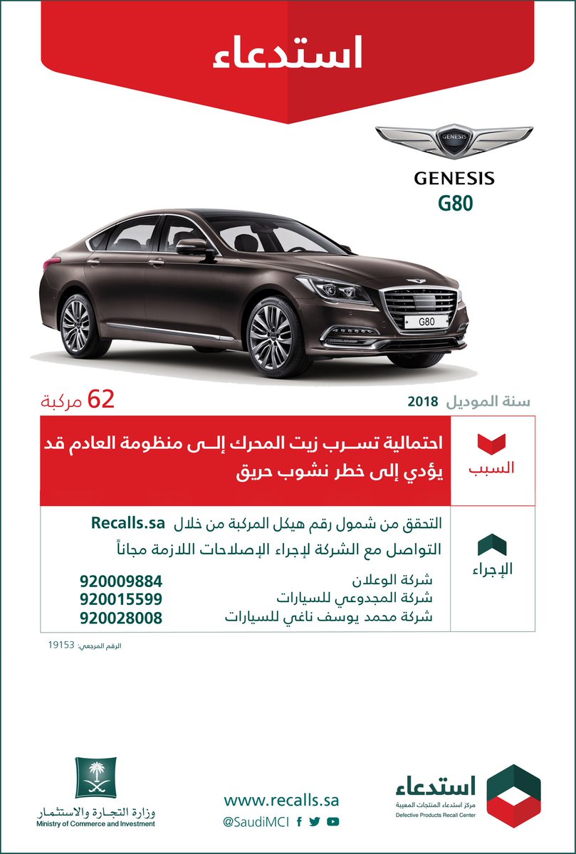 وزارة التجارة On Twitter التجارة تعلن عن استدعاء 65 مركبة G80 G90 Genesis 2017 2018 لاحتمالية تسر ب زيت المحرك إلى منظومة العادم قد يؤدي إلى خطر نشوب حريق