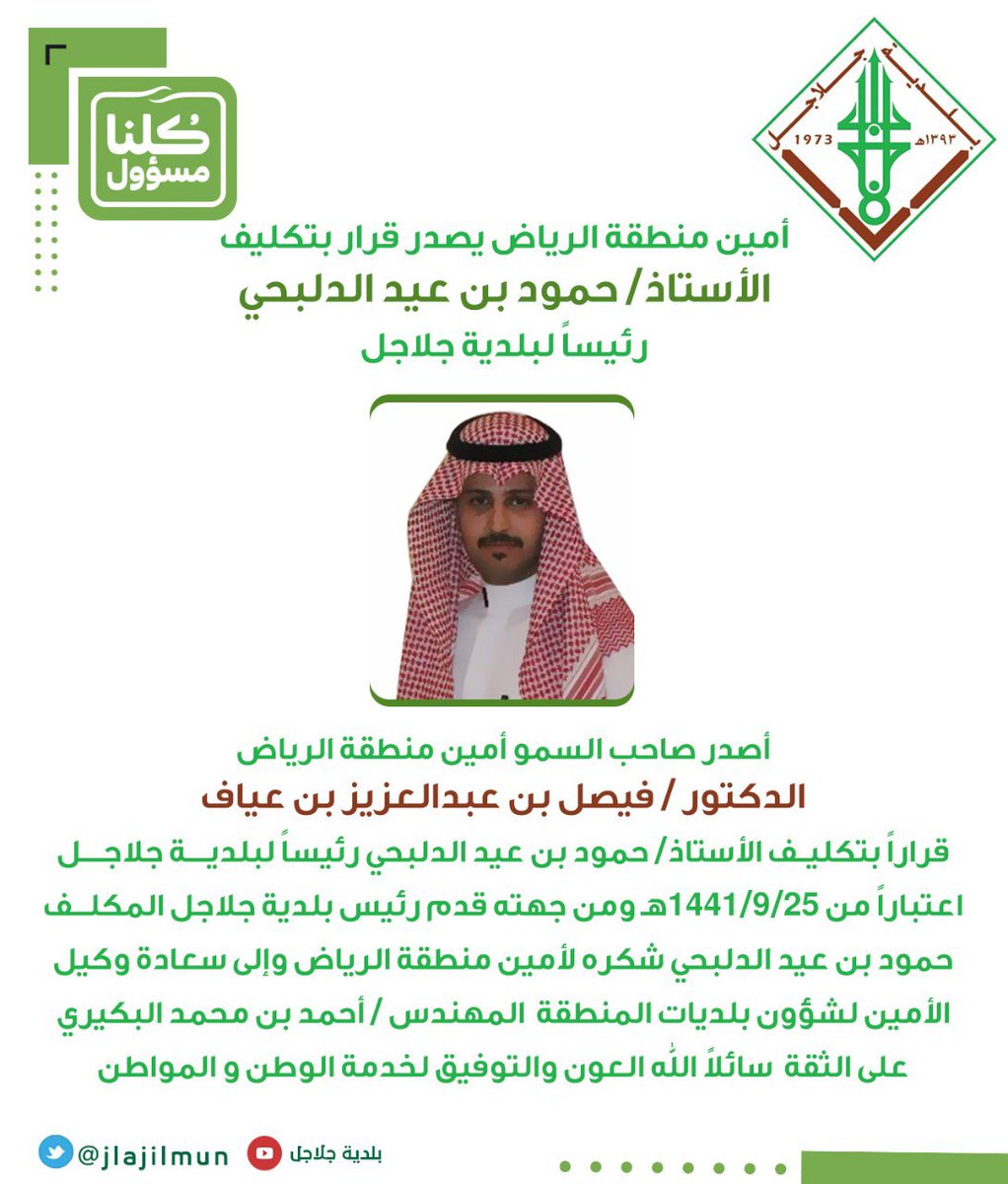 بــلــديــة جــلاجــل On Twitter أمين منطقة الرياض يصدر قرار بتكليف الأستاذ حمود بن عيد الدلبحي رئيسا لبلدية جلاجل كلنا مسؤول